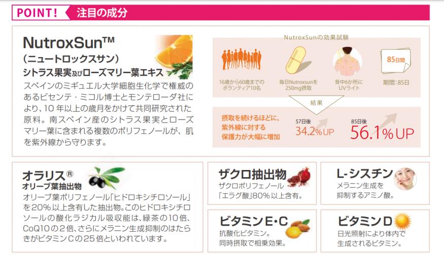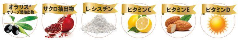 シトラス果実及びローズマリー葉エキス末、でんぷん、ザクロ抽出物、オリーブ葉抽出物、ビタミンE含有植物油、HPMC、ビタミンC、ステアリン酸カルシウム、L-シスチン、リン酸三カルシウム、微粒二酸化ケイ素、クチナシ黄色素、ビタミンD