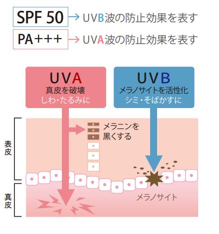 いほど紫外線を遮る時間が長く、PAは+が多いほどUVAを防ぐ効果が高くな