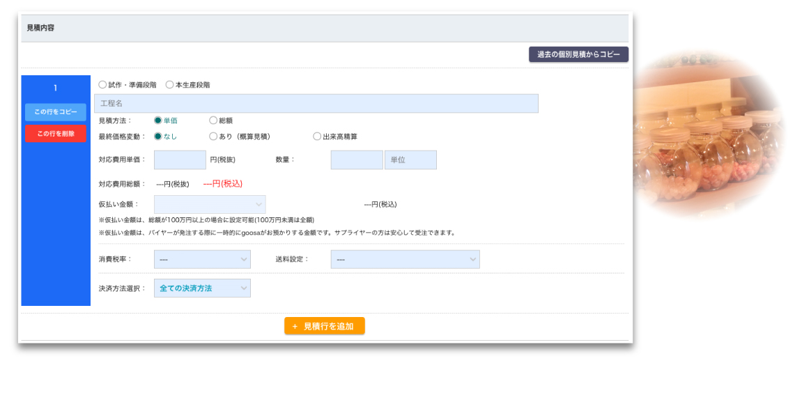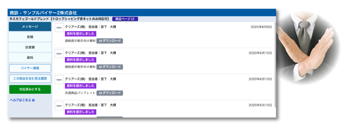 バイヤーの販路を予め確認でき、販路が未設定の場合や、ライバル企業であった場合などは御見積をお断りするなどの一般的商慣習の対応も可能です。
