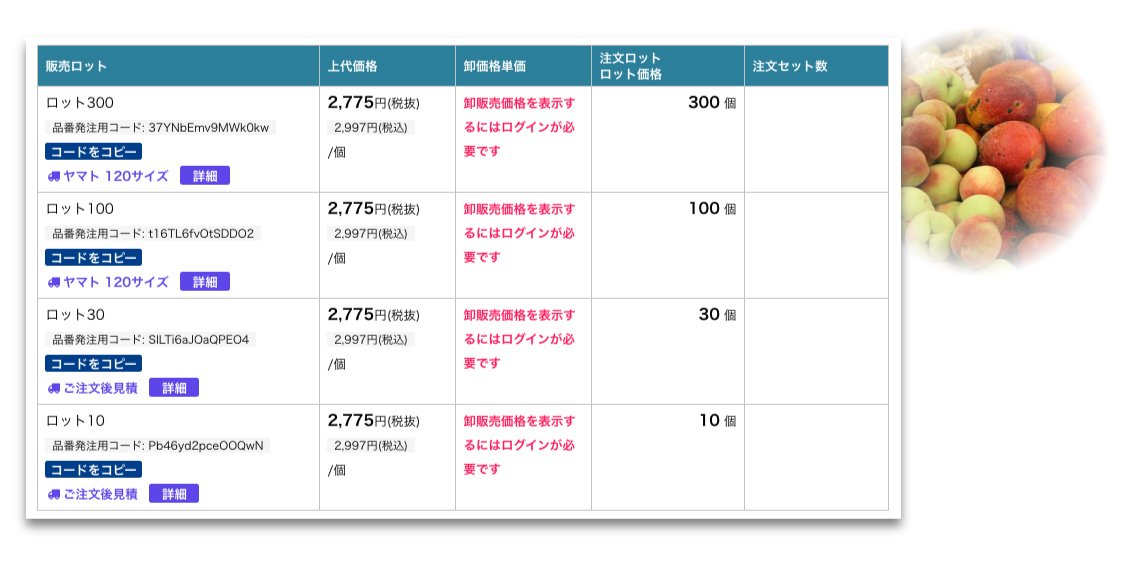 ロット毎に卸掛け率を変更し、またロット毎の送料を設定して、販売することが可能です。
